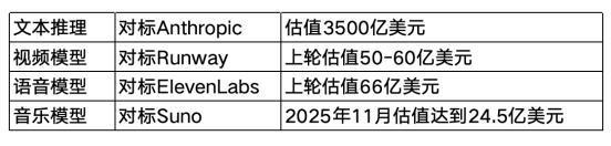 从业务对标角度看,MiniMax已建立起覆盖文本、视频、语音、音乐的全模态技术矩阵,其产品能力分别对应Anthropic(估值约3500亿美元)、Runway(约55亿美元)、ElevenLabs(约110亿美元)及Suno(约24.5亿美元)四家独角兽的核心业务。若采用分部估值法参考,其技术布局对应的潜在价值已达数百亿美元量级。