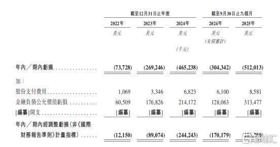 再看财务数据,根据公司财务数据,MiniMax 营收连续实现爆发式增长:2024 年营收同比激增 782% 至 3052 万美元,2025 年前三季度营收再增至 5344 万美元,同比增幅达 175%。盈利方面,近三年及2025 年前 3 季度公司经调整亏损分别是1215万美元、8907万美元、2.44亿美元、1.7亿美元及1.86亿美元,亏损有效缩窄。